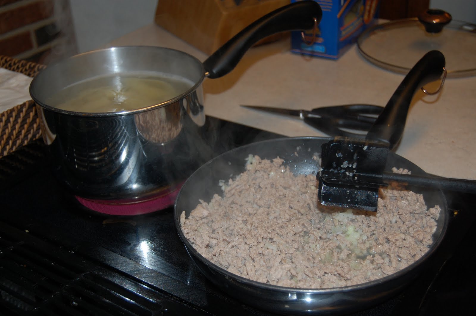 While boiling the water, cook the ground turkey over medium heat in a frying pan. When turkey is done, add in chopped onion and minced garlic.